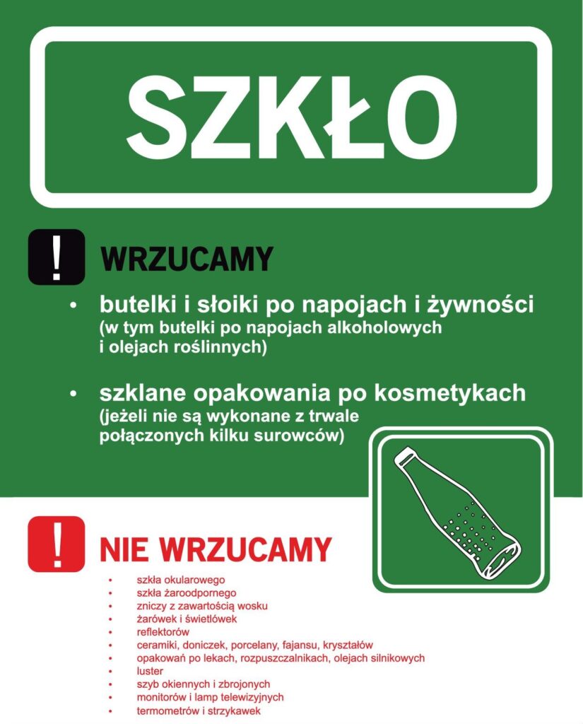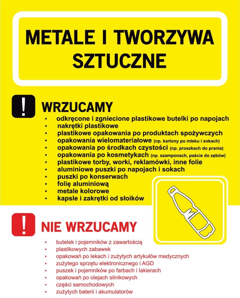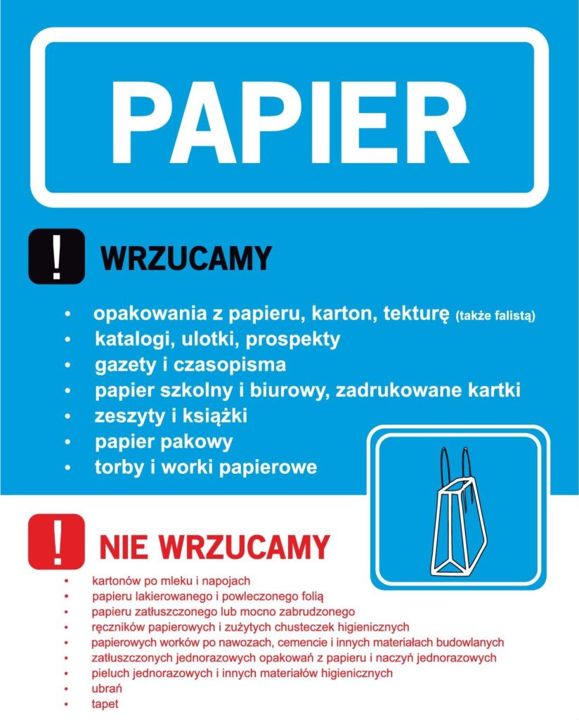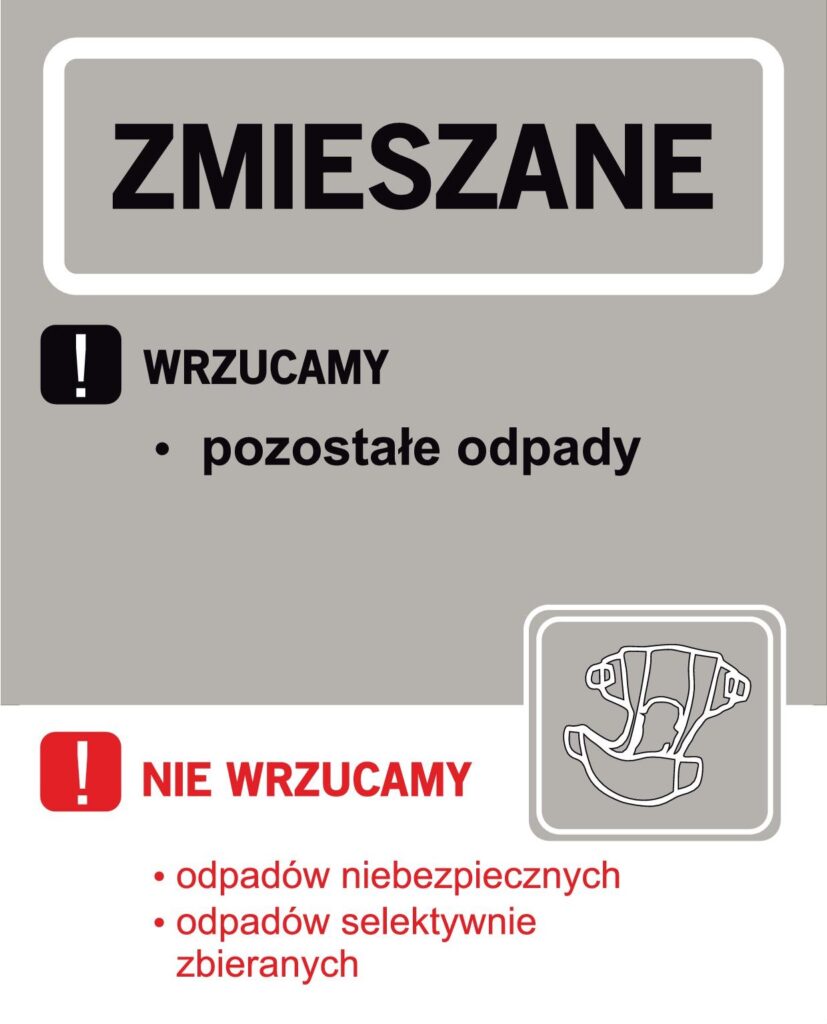 Zgodnie z rozporządzeniem Ministra Środowiska w sprawie szczegółowego sposobu selektywnego zbierania wybranych frakcji odpadów, udostępniliśmy właścicielom nieruchomości zamieszkałych i niezamieszkałych pojemniki i worki do selektywnej zbiórki odpadów: Metale i tworzywa sztuczne – kolor żółty, Papier – kolor niebieski, Szkło – Kolor zielony, Bio – kolor brązowy, Odpady resztkowe (zmieszane) – Kolor grafitowy, szary lub czarny.